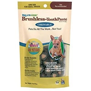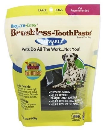 Now your pets can care for their own teeth! Ark Naturals BREATH-LESS Brushless Toothpaste is a multiple award-winning chewable dental solution for pets. BREATH-LESS Brushless Toothpaste is a highly digestible dental chew with clinically proven, natural herbal ingredients. On the outside: Fresh flavors of alfalfa (source of chlorophyll), cinnamon, vanilla and clove help freshen breath. Outside ridges help abrasive action. On the inside: Ark’s patented toothpaste center for plaque, tartar and bacteria control. Recipient of multiple awards as chosen by national pet magazines and their readers! Available in mini size, small/medium, medium/large and large. Use with BREATH-LESS Plaque Zapper for maximum benefits.