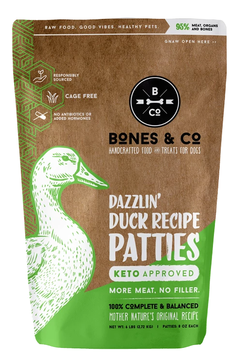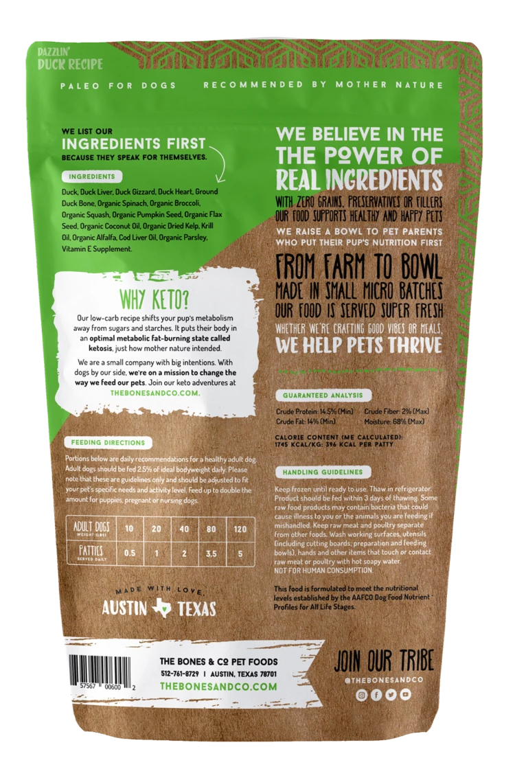 Duck, Duck Liver, Duck Gizzard, Duck Heart, Ground Duck Bone, Organic Spinach, Organic Broccoli, Organic Squash, Organic Pumpkin Seed, Organic Flax Seed, Organic Coconut Oil, Organic Dried Kelp, Krill Oil, Organic Alfalfa, Cod Liver Oil, Organic Parsley, Vitamin E Supplement.