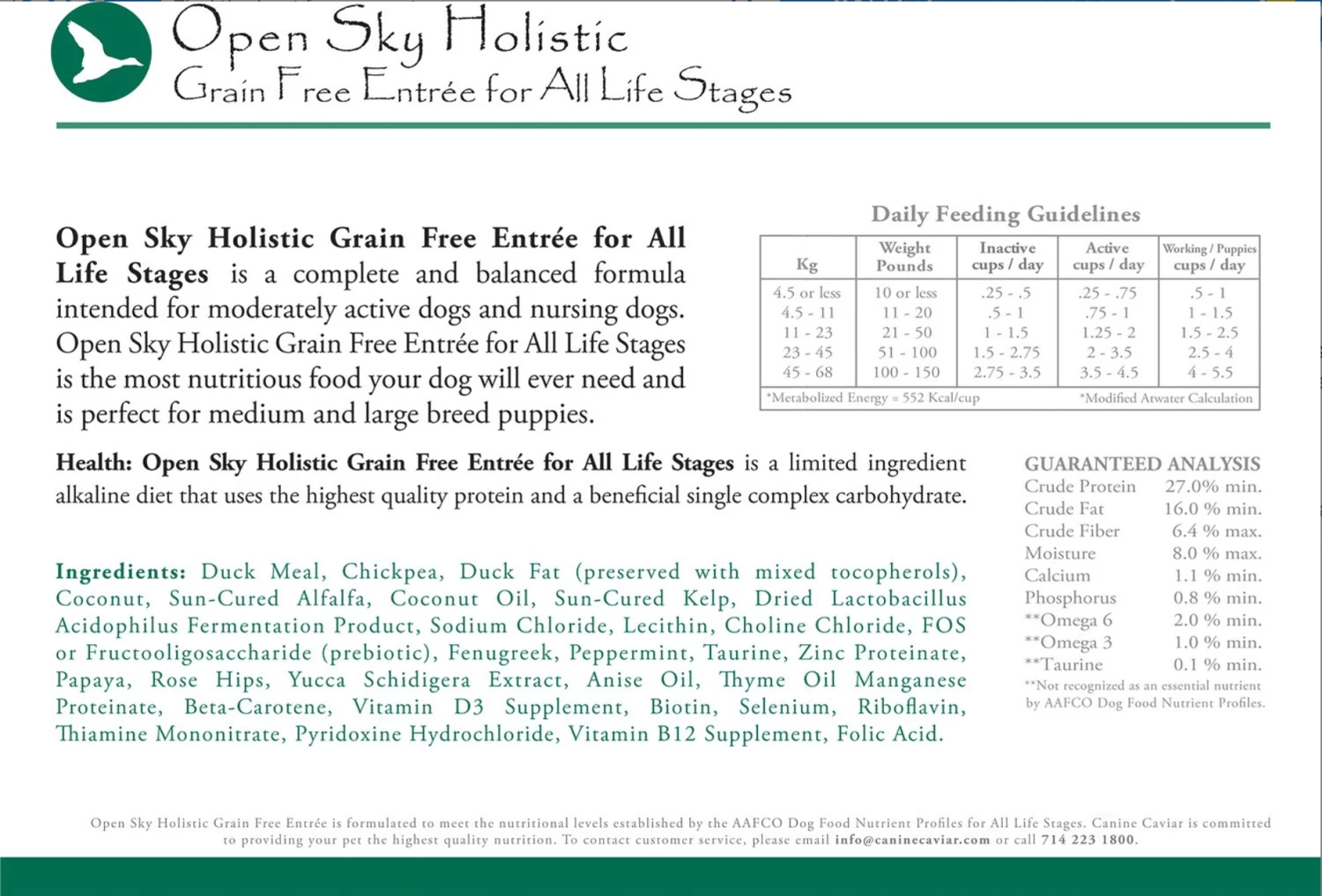 Canine Caviar’s Open Sky Grain Free Limited Ingredient Alkaline Holistic Dog Food for All Life Stages is a complete and balanced formula containing an excellent source of high quality, rich duck containing an excellent source of iron, selenium and niacin intended for all breeds. Canine Caviar’s Open Sky Grain Free Limited Ingredient Alkaline Holistic Dog Food is the most nutritious food for your dog with all natural ingredients to ensure a healthy lifestyle.