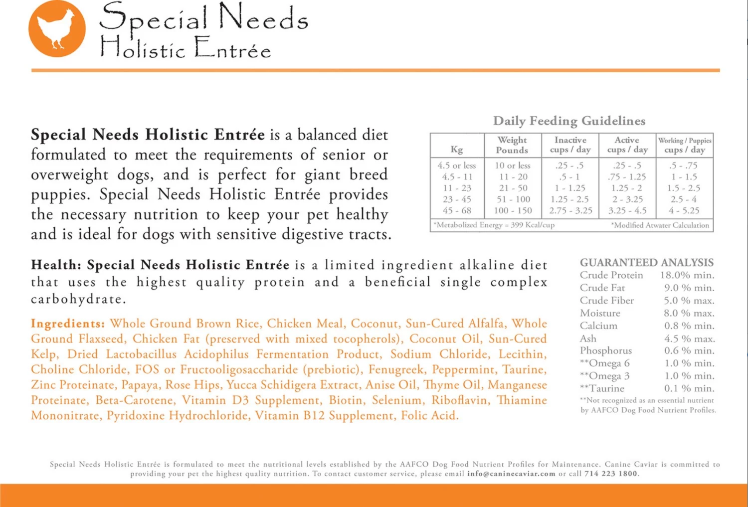 Canine Caviar’s Special Needs Limited Ingredient Alkaline Holistic Dog Food is a balanced diet using chicken and brown rice, one of the least likely grains to cause allergic reactions. It was formulated to meet the requirements of senior or overweight dogs, and is perfect for steady growth in giant breed puppies. Canine Caviar’s Special Needs Limited Ingredient Alkaline Holistic Dog Food is pH balanced at 7.5 – 8.0 to provide the necessary nutrition to keep your pet healthy while supporting your pet through a variety of health concerns. It is ideal for dogs with allergies and sensitive digestive tracts.