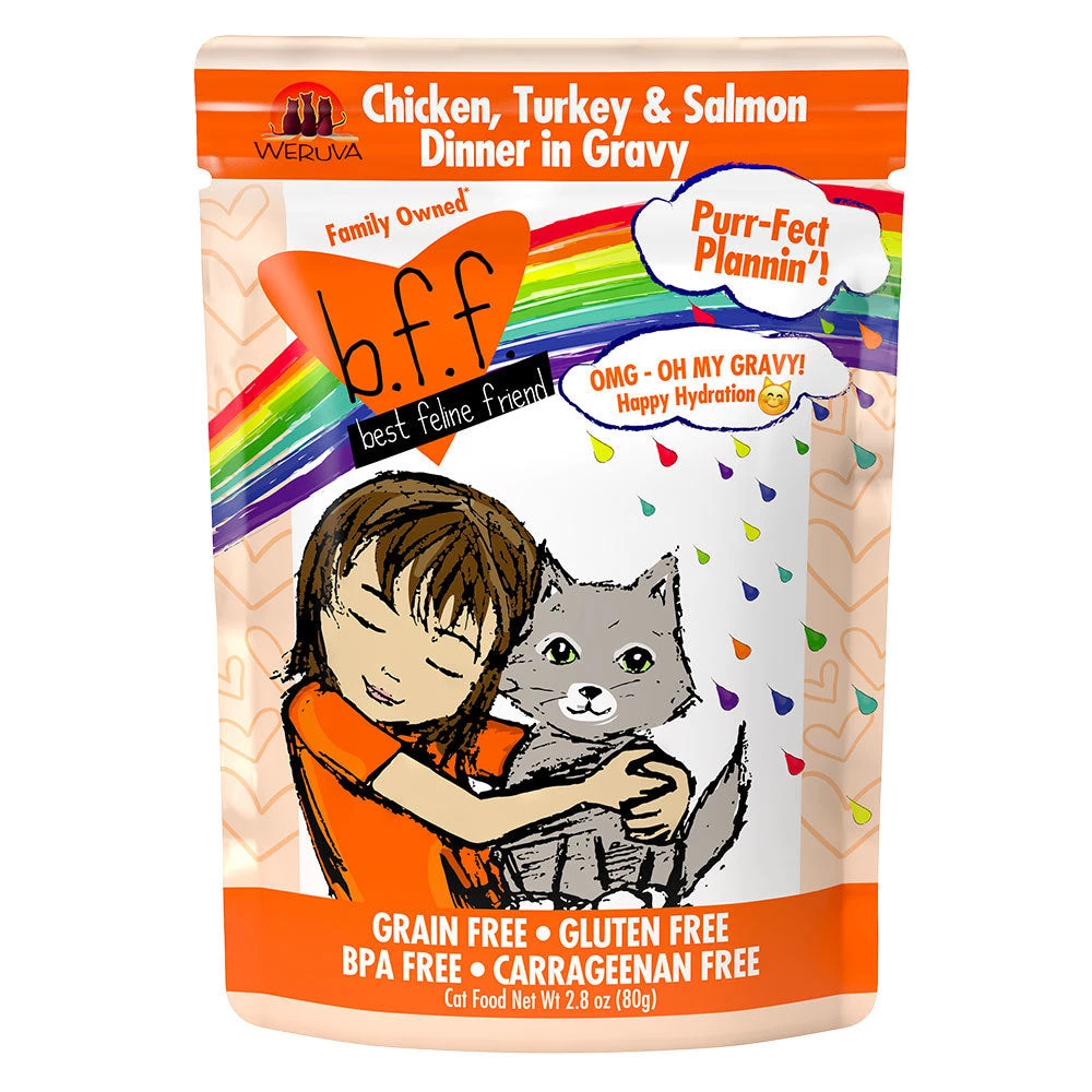 Chicken Broth, Chicken, Tuna, Turkey, Salmon, Potato Starch, Guar Gum, Calcium Lactate, Tricalcium Phosphate, Choline Chloride, Taurine, Zinc Sulfate, Vitamin E Supplement, Thiamine Mononitrate (Vitamin B1), Niacin Supplement (Vitamin B3), Calcium Panthotenate, Vitamin A Supplement, Potassium Iodide, Manganese Sulfate, Riboflavin Supplement (Vitamin B2), Pyridoxine Hydrochloride (Vitamin B6), Ferrous Sulfate, Copper Sulfate, Vitamin D3 Supplement, Folic Acid, Vitamin B12 Supplement, Menadione Sodium Bisulfite Complex (Source of Vitamin K).