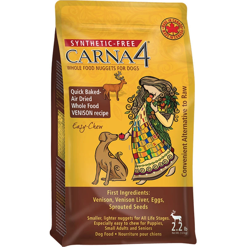 Carna4 Easy-Chew Venison Dog Food variety is whole food nutrition for all life stages. Customized with a slightly softer, smaller nugget – perfect for the little mouths of puppies and small breeds, as well as older dogs that have trouble with chewing. Carna4’s delicious air-dried nuggets are highly digestible and so densely packed with whole foods that you may need to feed 10-15% less per day than you are used to. Carna4’s venison formula is loaded with pastured New Zealand venison. Carna4 also includes whole produce and a mix of certified organic sprouted seeds that have been germinated to unleash a powerhouse of nutrients naturally, to support your dog’s intestinal health, energy, skin and coat. Quick-baked & then gently dried to give your dog bio-available vitamins & minerals, without synthetic additive. No pre-mix needed nor added.