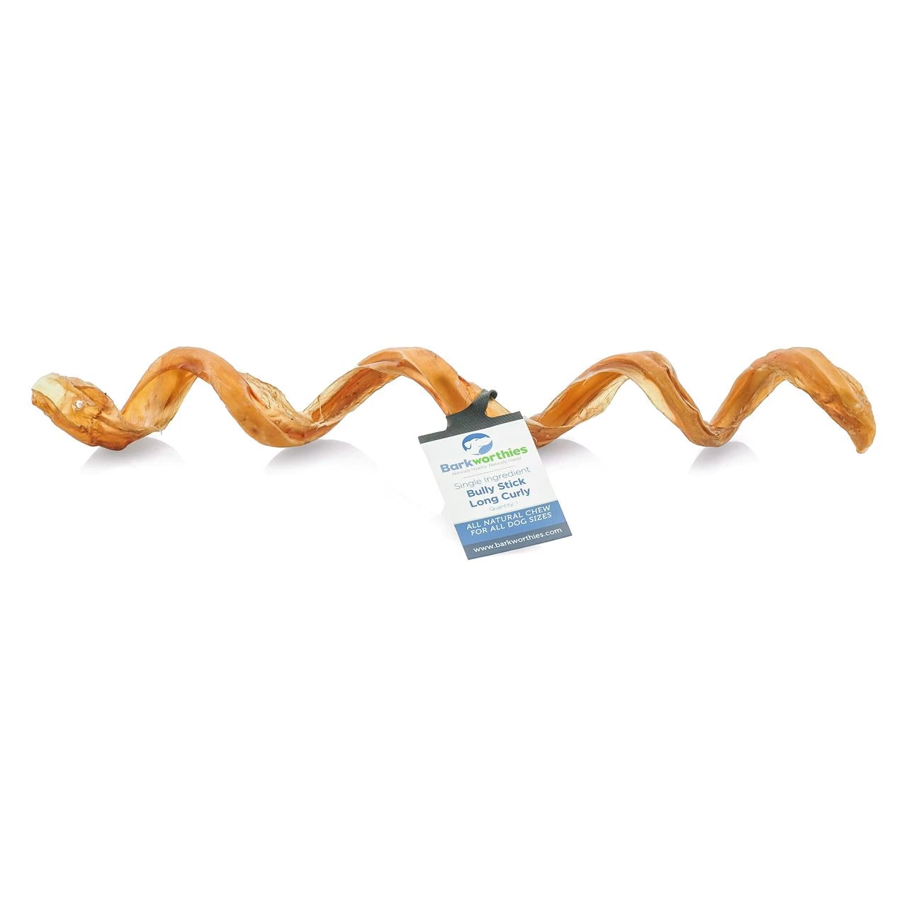 Barkworthies Long Curly Bully Sticks are shaped to add a change of pace to your dog’s daily routine! Dogs love the taste, texture and smell of these all-natural chews which average 10 to 12 inches in length.
