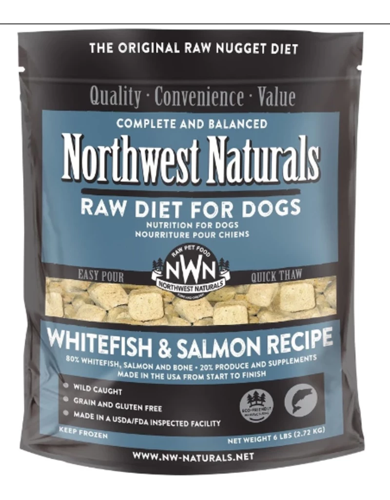 Whitefish with Ground Bone, Salmon with Ground Bone, Broccoli, Sweet Potatoes, Apples, Ground Flaxseed, Fish Oil*, Salmon Oil, Apple Cider Vinegar, Blueberry, Cranberry, Inulin, Dried Kelp, Potassium Chloride, Sodium Chloride, Ginger, Parsley, Garlic, Zinc Proteinate, Iron Proteinate, Vitamin E Supplement, Copper Proteinate, Manganese Proteinate, Mixed Tocopherols (as preservative), Vitamin D Supplement.