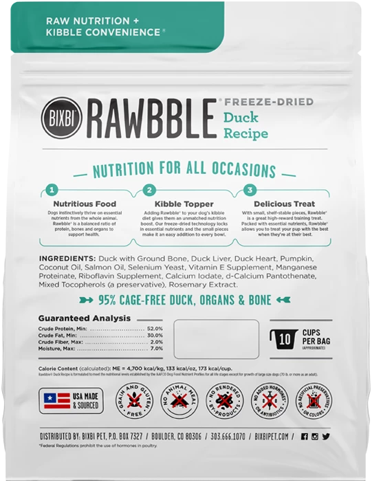 Duck with Ground Bone, Duck Liver, Duck Heart, Pumpkin, Coconut Oil, Salmon Oil, Selenium Yeast, Vitamin E Supplement, Manganese Proteinate, Riboflavin Supplement, Calcium Iodate, d-Calcium Pantothenate, Mixed Tocopherols (a preservative), Rosemary Extract.