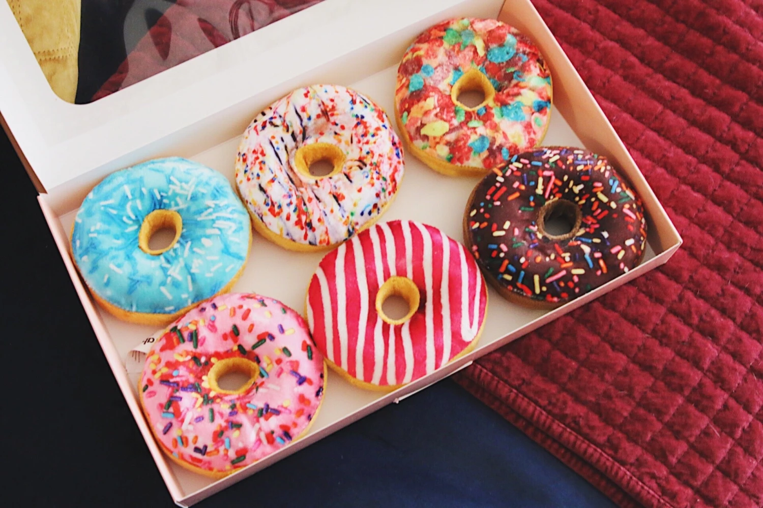 • 6 squeaky doughnuts – 4.5″ x 4.5″ x 2″ | Box – 13.5″ x 9″ x 2″