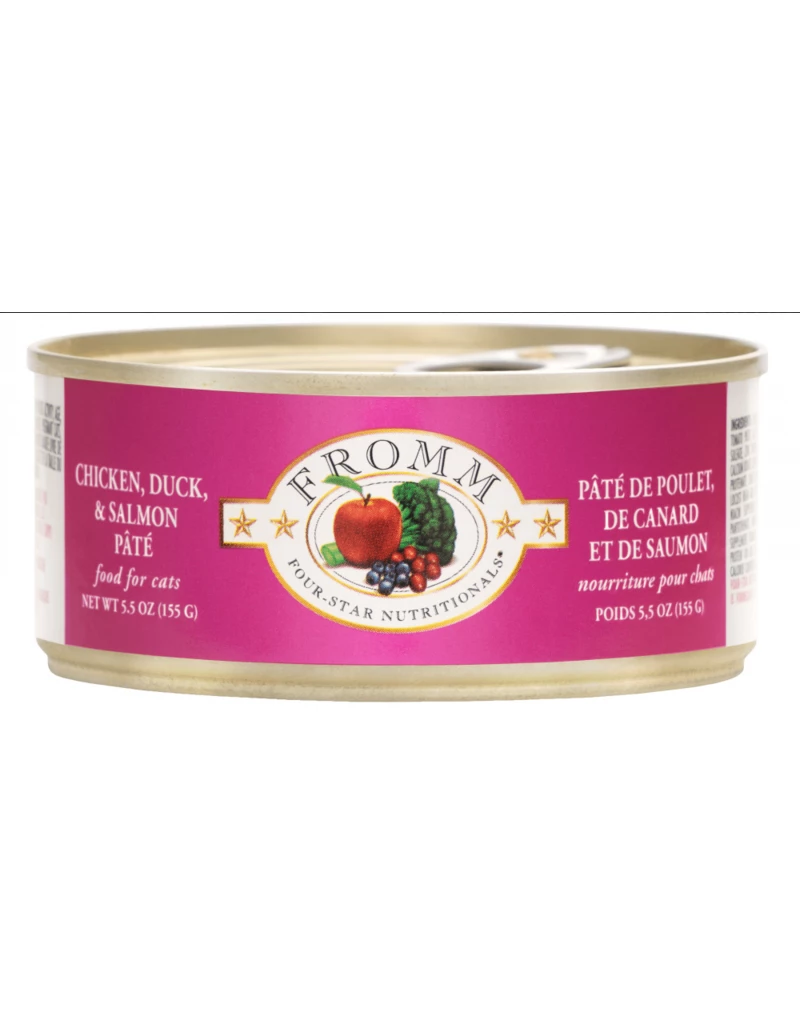Fromm Four-Star Nutritionals Chicken, Duck, & Salmon Pâté Food for Cats is formulated to meet the nutritional levels established by the AAFCO Cat Food Nutrient Profiles for All Life Stages.