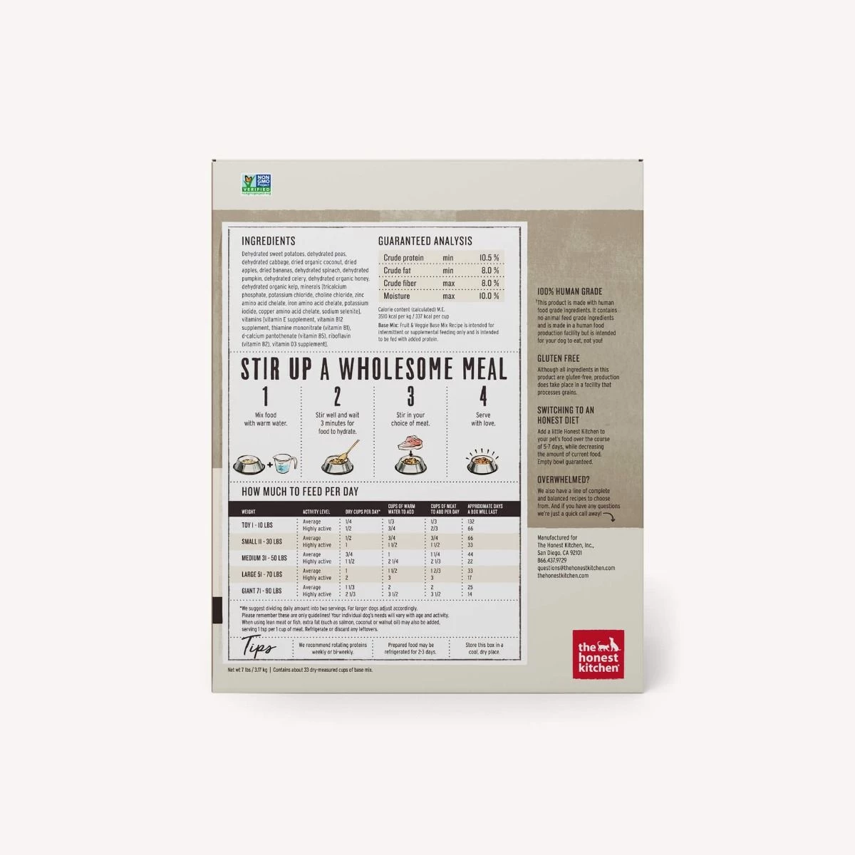 All ingredients dehydrated: Sweet potatoes, peas, cabbage, organic coconut, apples, bananas, spinach, pumpkin, celery, organic honey, organic kelp
