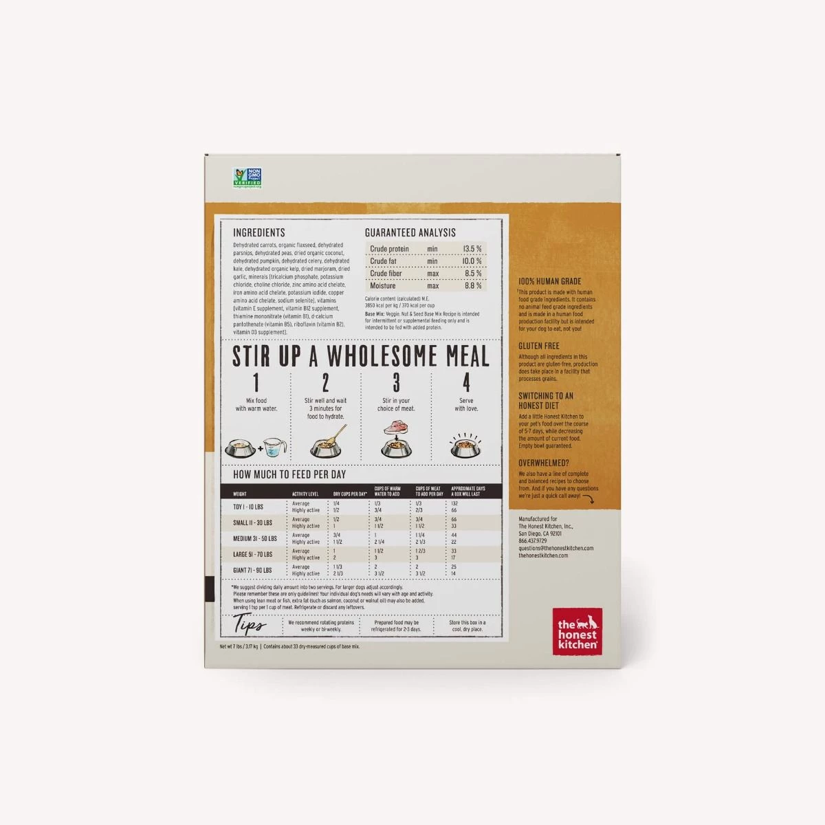All ingredients dehydrated: Carrots, organic flaxseed, parsnips, peas, organic coconut, pumpkin, celery, kale, organic kelp, marjoram, garlic