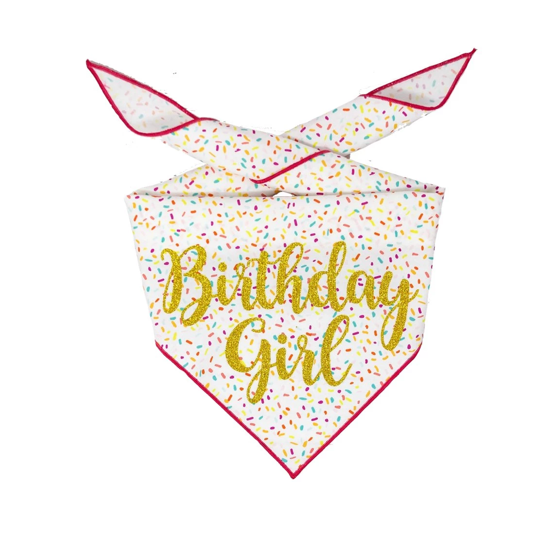 Colorful sprinkles pattern on lightweight cotton fabric. “Birthday Girl” in sparkly gold glitter vinyl. Pink rolled hem on all 3 sides.