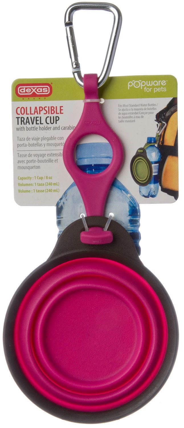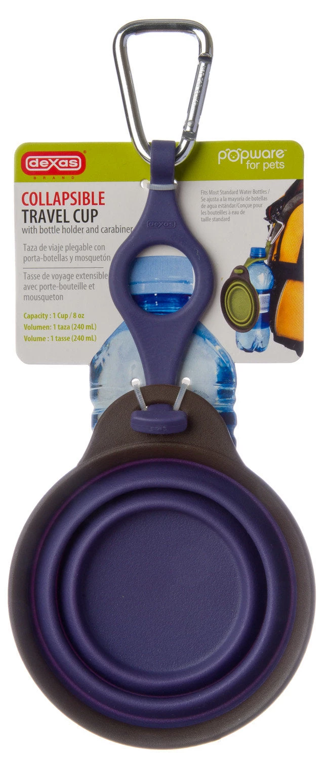 Got water! This is a must have for active pets on the go while traveling, hiking or just on a walk. Collapsible cup with bottle holder is the perfect solution for thirsty or hungry dogs. Clip easily latches onto belt loops, leashes, backpacks, strollers or purses. Collapses to less than 0.5 inches thick. Bottle holder ring fits most standard water bottles.