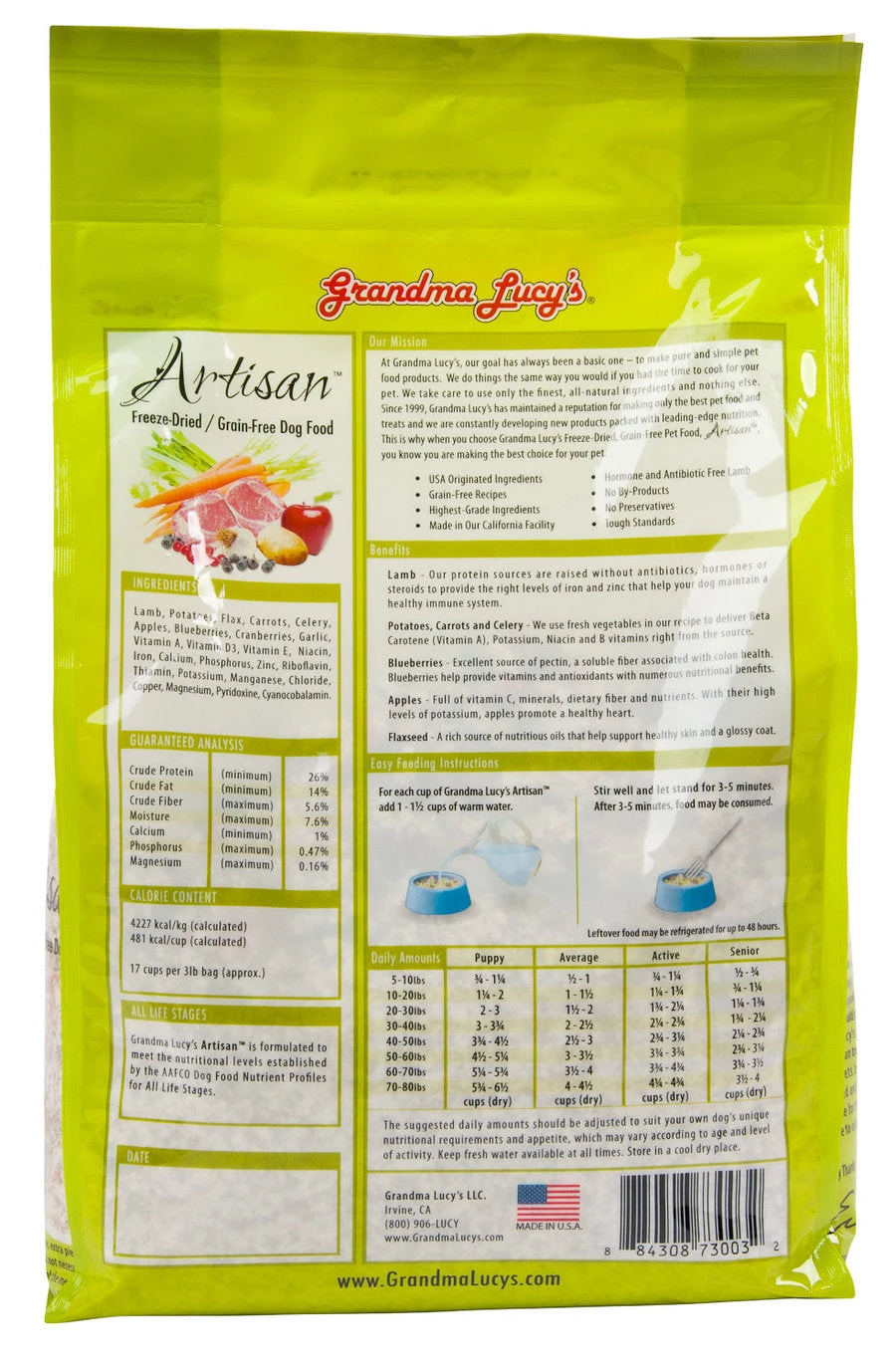 Feeding Instructions: Each serving of Grandma Lucy’s ARTISAN™ should be rehydrated with 1 to 1 1/2 cups of warm water per 1 cup serving.