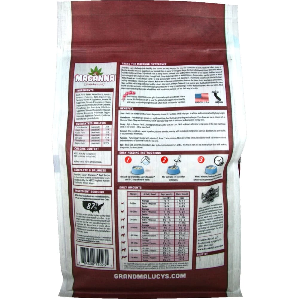 Beef, Pinto Beans, Hemp Hearts, Carrots, Coconut, Pumpkin, Kale, Blueberries, Turmeric, Vitamin A Supplement, Vitamin D3 Supplement, Vitamin E Supplement, Niacin Supplement, Iron Proteinate, Calcium Carbonate, Phosphorous, Zinc Proteinate, Riboflavin Supplement, Thiamine Mononitrate, Potassium Chloride, Manganese Proteinate, Copper Proteinate, Magnesium Chloride, Pyridoxine Hydrochloride, Vitamin B12 Supplement.