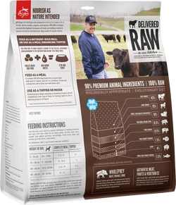 Freeze-dried animal ingredients provide your dog with a rich, concentrated source of protein and nutrients, just like a raw diet – but in a convenient, dry form. ORIJEN Regional Red Freeze-Dried Food is brimming with 90% meat, organs, cartilage, and bone from raw ranch-raised beef, grass-fed lamb, wild boar, Yorkshire pork, wild-caught flounder and herring, and ranch-raised bison. By using the whole prey animal, your dog is getting a Biologically Appropriate diet, with 36% protein and all the nutrients they require, naturally, so they can stay healthy and thriving, with a taste that will have them drooling over every meal.