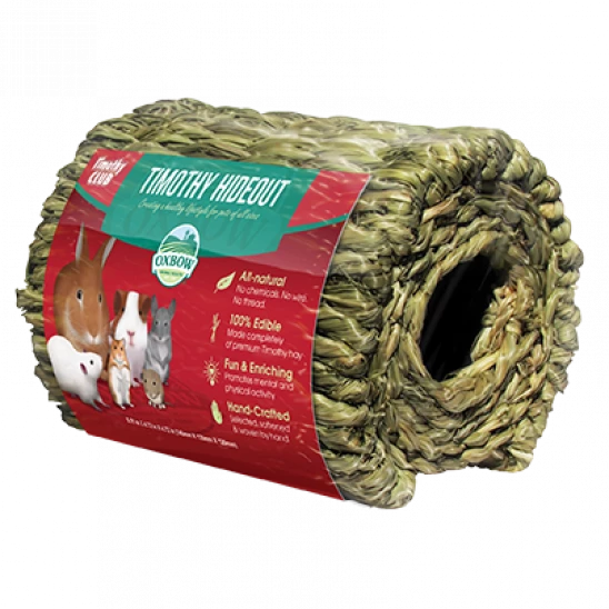 The perfect accessory for small pets! The 100% hand-woven, 100% hay Timothy Hideout is the ideal size for smaller pets such as hamsters and gerbils to hide, burrow, and nest in. Stuff with hay or healthy treats to encourage hamster and gerbil burrowing, or use as a hay manger for larger pets like rabbits, guinea pigs, and chinchillas. 100% natural and hand-woven to perfection. Â