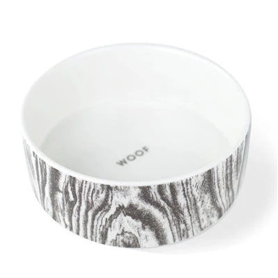 Ceramic pet bowl features wood grain artwork and reads “Woof” on the inside bottom of bowl. Dishwasher/microwave safe.