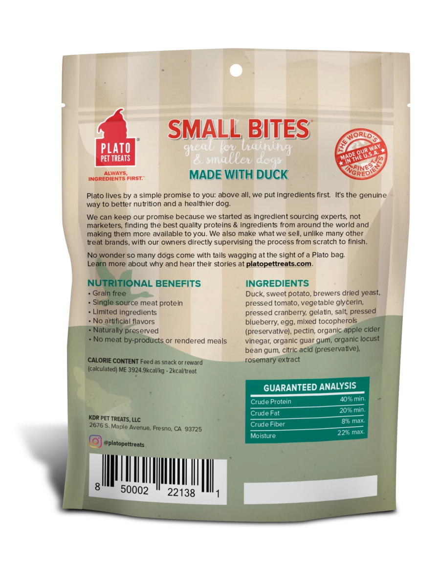 Duck, sweet potato, brewers dried yeast, pressed tomato, vegetable glycerin, pressed cranberry, gelatin, salt, pressed blueberry, egg, mixed tocopherols (preservative), pectin, organic apple cider vinegar, organic guar gum, organic locust bean gum, citric acid (preservative), rosemary extract