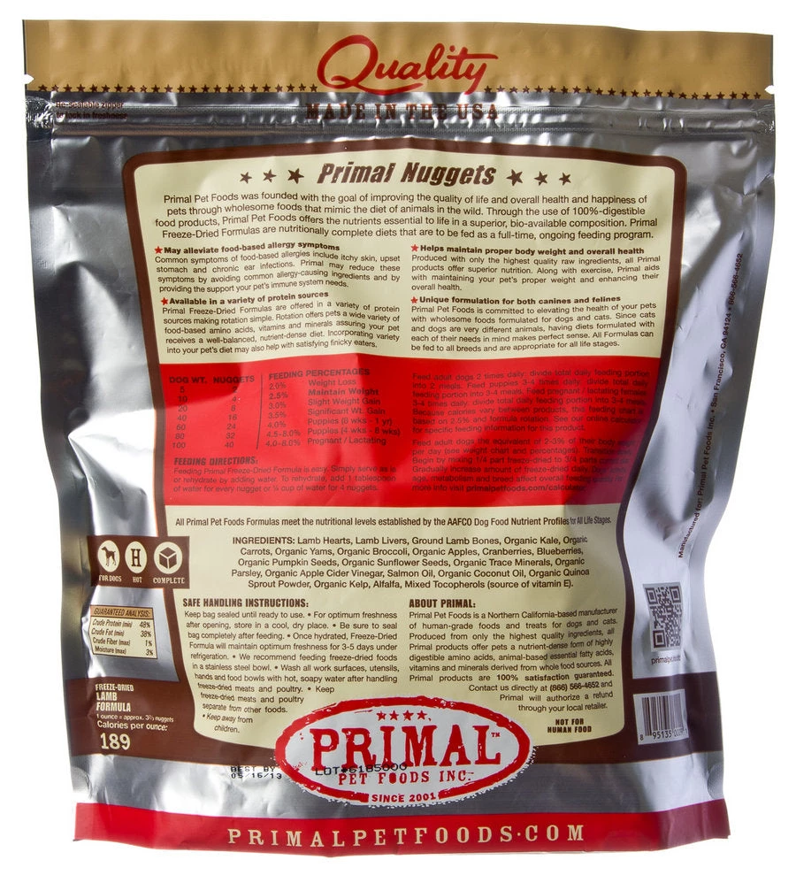 Ingredients: Lamb Hearts, Lamb Livers, Ground Lamb Bones, Organic Kale, Organic Carrots, Organic Yams, Organic Broccoli, Organic Apples, Cranberries, Blueberries, Organic Pumpkin Seeds, Organic Sunflower Seeds, Organic Trace Minerals, Organic Parsley, Organic Apple Cider Vinegar, Salmon Oil, Coconut Oil, Organic Quinoa Sprout Powder, Organic Kelp, Alfalfa, Mixed Tocopherols (source of vitamin E).