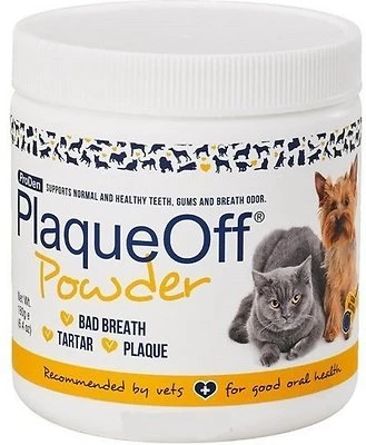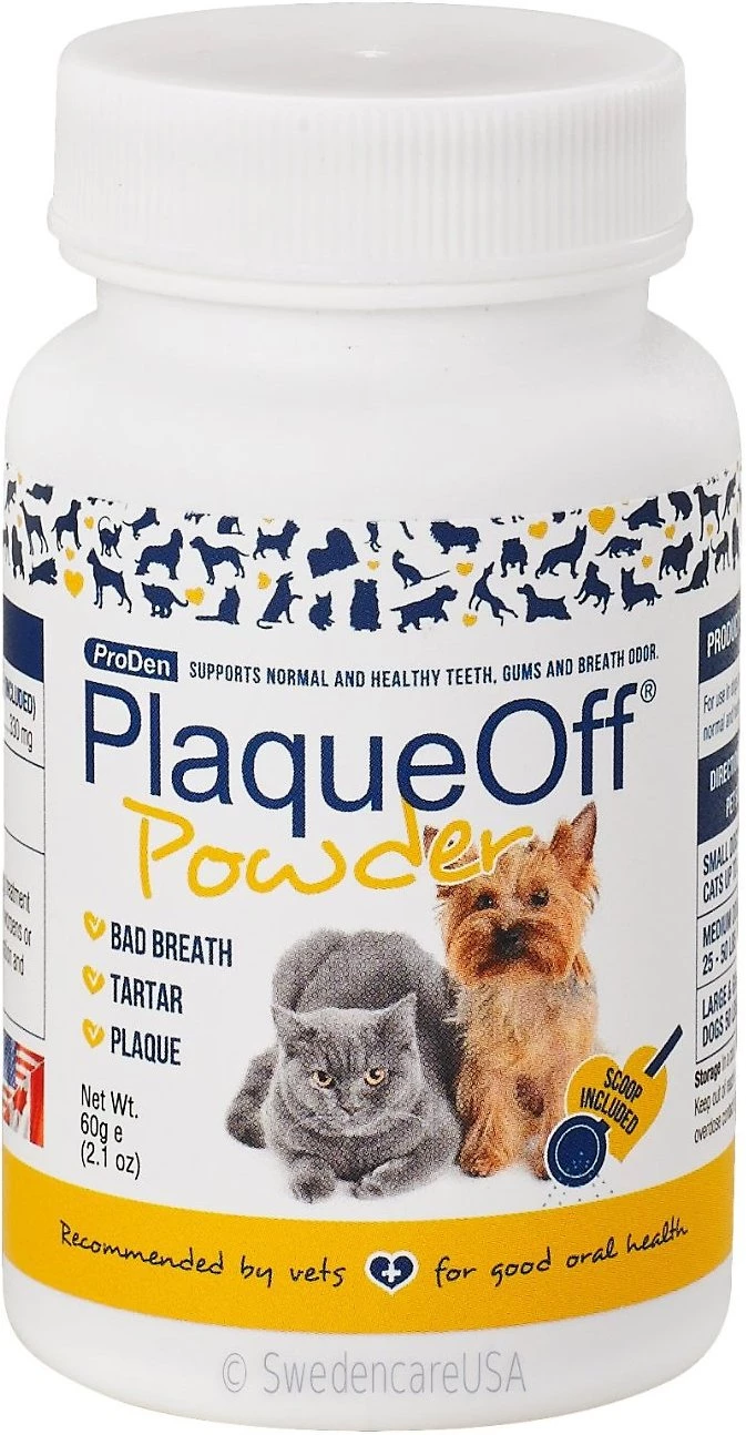 ProDen PlaqueOff Powder is a pet dental product for dogs available from veterinary practices and selected pet shops. Used daily, this 100% natural product made from seaweed can significantly complement your pet’s ordinary dental hygiene.
