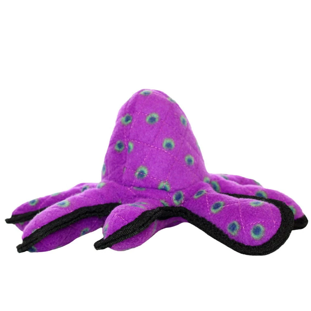 Oscar the Octopus. This small but mighty octopus, is perfect for tug time or ideal for interactive play especially with multiple dogs. The soft edges are easy on your dog’s gums and teeth and it floats! Size: 12x 12x 5. Tuffy Dog Toys are designed to be Interactive Play toys not chew toys.