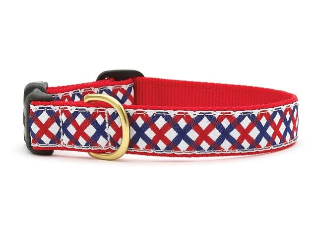 Up Country’s ribbon collars, Wide = 1 inch Ribbon collars are made from high-tensile strength nylon webbing with sewn on polyester/nylon ribbons. Our ribbons are stain and fray resistant; designed to last a lifetime. All collar and lead hardware is cast, not welded brass for extra strength. Our buckles are Coast Guard approved for high weight hold. Machine wash cold, air dry.