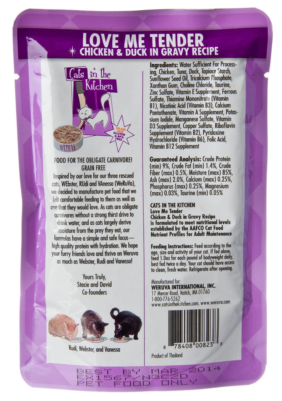 Ingredients: Water Sufficient For Processing, Chicken, Tuna, Duck, Tapioca Starch, Sunflower Seed Oil, Tricalcium Phosphate, Xanthan Gum, Choline Chloride, Taurine, Zinc Sulfate, Vitamin E Supplement, Ferrous Sulfate, Thiamine Mononitrate (Vitamin B1), Nicotinic Acid (Vitamin B3), Calcium Pantothenate, Vitamin A Supplement, Potassium Iodide, Manganese Sulfate, Vitamin D3 Supplement, Copper Sulfate, Riboflavin Supplement (Vitamin B2), Pyridoxine Hydrochloride (Vitamin B6), Folic Acid, Vitamin B12 Supplement