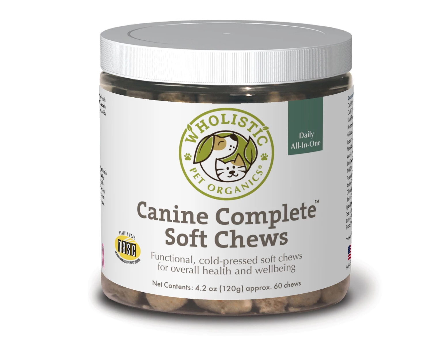 High bioavailability is ensured by the use of pure, organic, whole-food sources. Not only does Wholistic Canine Complete™ soft chews offer all required nutrients in a whole-food form that is easily and readily digestible, but it offers the highest quality of premium ingredients! No other supplement comes close in offering the quality and quantity of nutrients that are a staple of the Wholistic Pet Organics® full line of supplements and food.