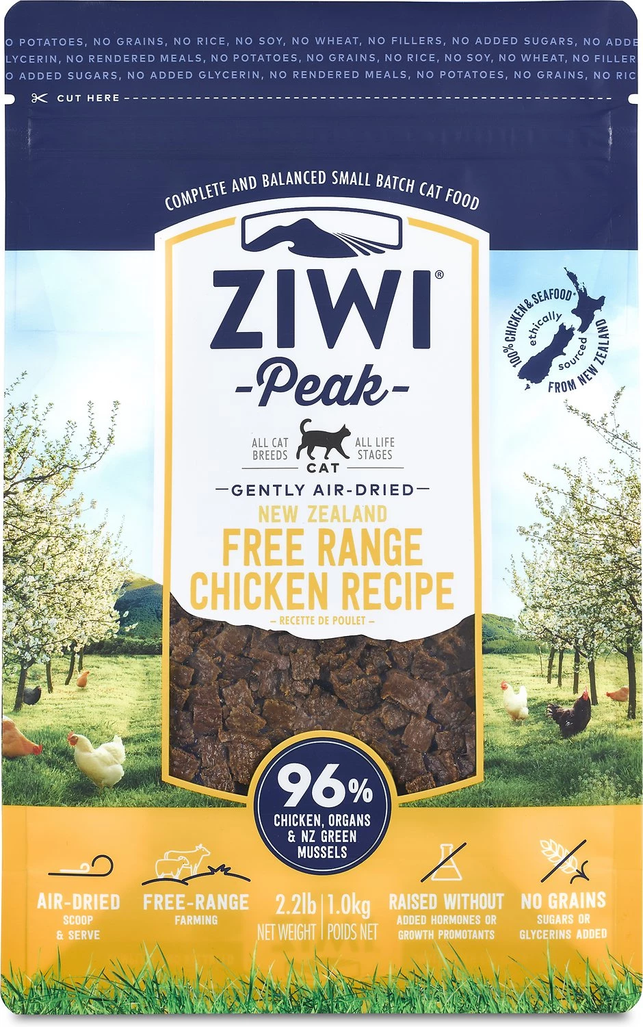 Chicken, Chicken Liver, Chicken Heart, New Zealand Green Mussel, Chicken Bone, Lecithin, Inulin from Chicory, Dried Kelp, Minerals (Dipotassium Phosphate, Magnesium Sulfate, Zinc Amino Acid Complex, Copper Amino Acid Complex, Iron Amino Acid Complex, Manganese Amino Acid Complex, Sodium Selenite), Salt, Preservative (Citric Acid, Mixed Tocopherols), Vitamins (Choline Chloride, Thiamine Mononitrate, Pyridoxine Hydrochloride, Folic Acid, Vitamin D3 Supplement), DL-Methionine, Taurine.